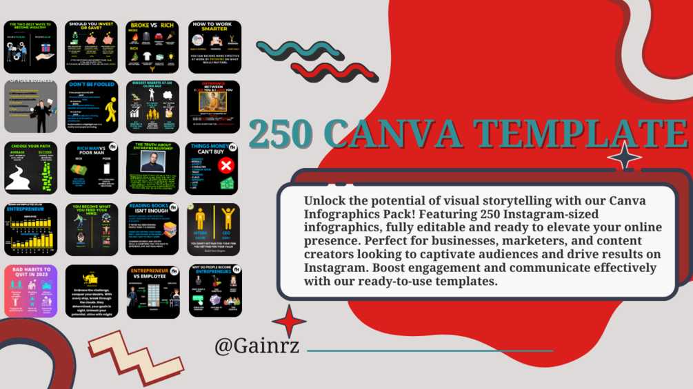 Description: Power Up Your Instagram Presence with 250 Captivating Canva Templates! Stop wasting time creating graphics from scratch and elevate your Instagram game with stunning visuals designed specifically for motivational quotes and business infographics.